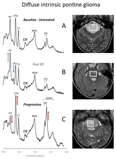 Among pediatric brain tumors, diffuse intrinsic pontine gliomas (DIPGs) carry the worst prognosis. They are highly resistant to chemo- and radiation therapy and, due to their location in the brainstem, inoperable. Thus, with no effective therapy available, the average survival after diagnosis is less than one year [46]. In vivo MR spectroscopy studies showed that, at initial diagnoses, these tumors often present with metabolic profiles that are consistent with low-proliferative tumors. The metabolism of DIPG then evolves into a profile typical for high-grade gliomas consistent with the observation that, at autopsy, most DIPGs have progressed to glioblastoma (Figure 6) [47,48]. These changes may precede clinical deterioration and progression on MRI, and MR spectroscopy could thus provide non-invasive biomarkers that help with patient management [49].