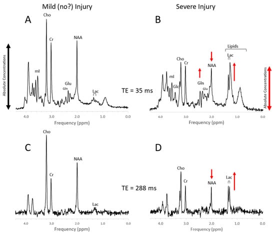Severe, acute injury is recognized by elevated lactate and lipids and a reduction of the axonal/neuronal marker NAA and often mimics MRS patterns that are observed in hypoxic–ischemic injury, consistent with the interruption of blood perfusion and subsequent apoptosis and cell death (Figure 12). In more mild/moderate cases of traumatic brain injury, NAA may be mildly or only transiently reduced, whereas Cho is often elevated, possibly reflecting axonal injury and subsequent repair processes [95,96,97,98,99].
