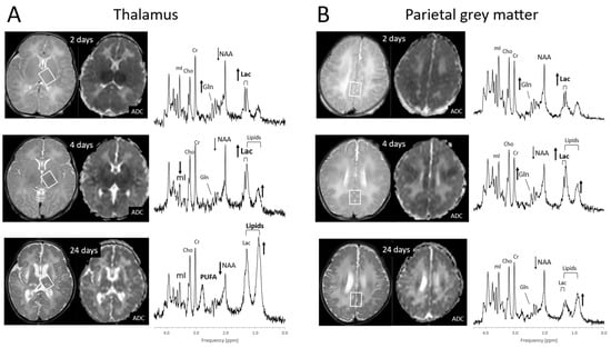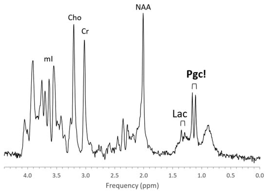 The metabolic profiles of HIE evolve as the injury evolves. Lactate is prominent and glutamine (Gln) is elevated at the very early stage (1–2 days) with NAA more moderately decreased. Edema formation may also have an overall impact on metabolite profiles and concentrations during the acute phase of HIE. With subsequent cell death in severe HIE, a more substantial reduction of NAA and increased lipids are observed (Figure 8). Kreis et al. suggested that MRS performed 3–4 days after injury had higher predictive value for outcome than when done at 1–2 days; however, their study was performed in older children [73]. Of note, propylene glycol (Pgc), when used as a vehicle for medications, can accumulate in tissue and can be misidentified as lactate as their signals are similar [74]. This is avoided by appreciating the different positions of their signals on the frequency axis at ≈1.14 ppm for Pgc vs. ≈1.33 ppm for Lac (Figure 9). Pgc is ultimately metabolized to lactate and is, therefore, a potential exogenous source of lactate.