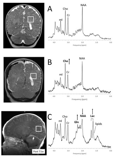 - Cecil, K.M.; Lindquist, D.M. Infection and Encephalitis. In MR Spectroscopy of Pediatric Brain Disorders; Springer: New York, NY, USA, 2013; pp. 155–166. [Google Scholar]