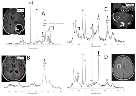 Acute abscesses can present with metabolic profiles that are strikingly unusual depending on the organism (bacteria, fungi) that is causing them (Figure 13A). The presence of cytosolic amino acids (e.g., leucine, isoleucine, and valine at 0.8 ppm) has been consistently reported both in aerobic and anaerobic pyogenic lesions with varying amounts of lactate and lipids. Acetate at 1.9 ppm and succinate at 2.4 ppm may also be observed as well as other signals that yet need to be assigned [100,101,102,103]. Abscesses that have been treated successfully may present with elevated Lac and lipids with all other metabolites being depleted (Figure 13B).