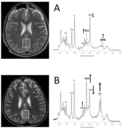 A ketogenic diet is effective in reducing seizure activities for a subgroup of patients. Albeit ketosis can readily be monitored with urine ketone levels, it should be noted that the accumulation of ketone bodies in the brain can be observed with in vivo MRS [129] (Figure 14).