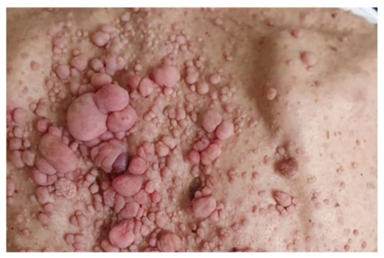 A 64-year-old male patient with NF1: multiple and variable-sized cutaneous neurofibromas of his back.