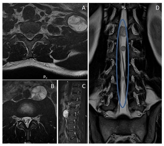 Multiple neurofibromas in an NF1 patient. (A) Left laterocervical mass, non-homogeneous, well-defined T2 axial view; (B) left lumbar para-aortic mass on T2 axial view and (C) STIR sagittal view. (D) Intracanalar lumbar tract myelography MRI.