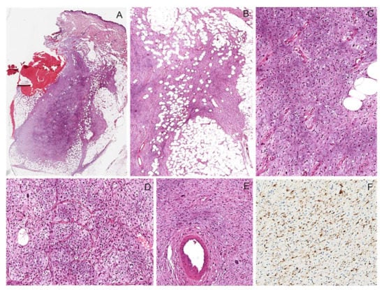 Diffuse neurofibroma occurs more often in the younger age group, including children. Although a number of these lesions may present as isolated/solitary manifestations, they should be regarded as mosaic NF1 lesions or other NF1 stigmata should be carefully searched for [,] (Table 2 and Table 4). It usually presents as a plaque-like lesion of the dermis/subcutaneous tissue of the head/neck region. Histologically, diffuse neurofibroma presents as an ill-defined dermal/subcutaneous mass with infiltrative margins entrapping (without destroying) cutaneous adnexal and nerve structures and with extension to the subcutaneous fat, especially along connective tissue septa (Figure 5). The neoplastic cells, closely intermingling with adipocytes, impart the tumor with a honeycomb effect similar to that seen in dermatofibrosarcoma protuberans [] (Figure 5). In contrast to the other types of neurofibroma, the diffuse type is composed of short spindled to round cells with small, hyperchromatic, wavy or comma-shaped nuclei. The neoplastic cells are haphazardly set in a uniformly fine fibrillary stroma with variably myxoid changes. Some tumors may contain clusters of pseudomeissnerian-body-like structures that seem to be a characteristic feature of diffuse-type neurofibroma [,]. Notably, in NF1 patients, it is not uncommon to detect tumor cells admixed with large ectatic vessels and occasionally with branching plexiform-type capillary-like vessels, as seen in myxoid liposarcoma (Figure 5D). In a minority of tumors, neoplastic cells may focally adopt an epithelioid morphology or contain scattered dendritic cells with intracytoplasmic melanin. Although surgical excision with free margins is usually curative, these lesions can be difficult to radically remove. The risk of malignant transformation into a malignant peripheral nerve sheath tumor is very low [].