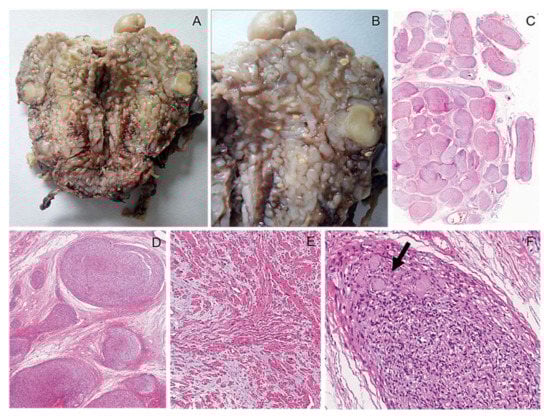 Plexiform neurofibroma. (A) Macroscopic appearance of a peritoneal multinodular mass with a plexiform pattern and greyish color; (B) the classic “bag of worms appearance” can be noticed. (C) Low-magnification images showing the typical nodular/plexiform growth pattern. (D) High-magnification image showing serpentine nerve-like structures embedded in an abundant myxo-edematous stroma rich in haphazardly arranged thick collagen fibers (shredded carrots appearance) (E). Occasional Wagner–Meissner corpuscles (lamellar growth pattern) can be observed (arrow) (F).