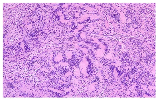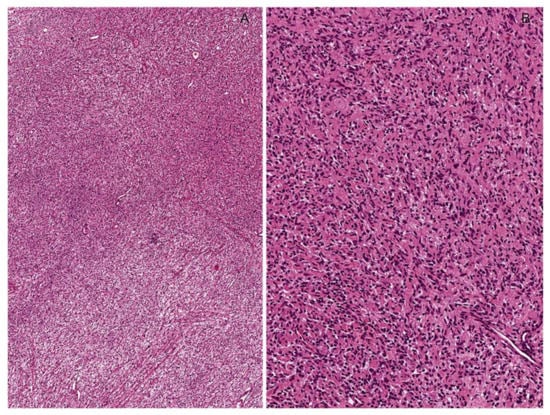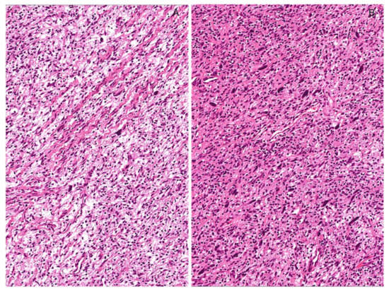 Apart from cytological atypia, the term “cellular neurofibroma” should be restricted to those tumors in which hypercellularity is the only worrisome feature and in the absence of increased mitotic activity, cytological atypia, and/or the loss of neurofibroma architecture []. Histologically, cellular neurofibroma can be appreciated at low magnification for the presence of areas with greater cellularity and the fascicular arrangement of neoplastic cells [] (Figure 8). Similar to cytological atypia, hypercellularity alone is not by itself a criterion of malignancy. Cellular neurofibroma should be extensively sampled to rule out the presence of areas with cytological atypia and/or increased mitotic activity. As in neurofibroma with cytological atypia, it should be emphasized that the diagnosis of cellular neurofibroma should be rendered with caution when a pathologist is dealing with small biopsies from NF1 patients. Similarly, radiological correlation is crucial, suggesting obtaining multiple core biopsies from those areas with a high suspicion of malignant overgrowth to avoid the risk of tumor undersampling. Cellular neurofibroma is treated conservatively, even in presence of positive margins.