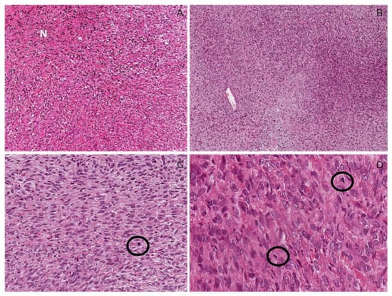 Atypical neurofibromatous tumor with uncertain biological behavior. (A) Low-magnification image showing hypercellular tumor with focal area reminiscent of neurofibroma (N). (B) Tumor area with alternating hypercellular and hypocellular areas. (C,D) Mitoses (circles) and moderate nuclear atypia are seen (D); tumor necrosis was absent.