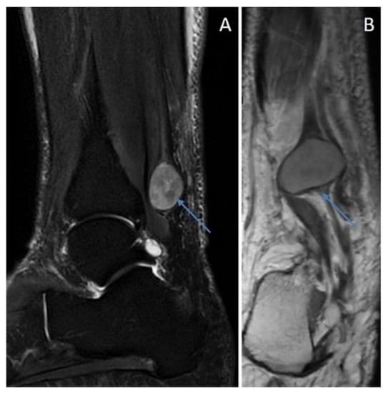 Solitary schwannoma: round mass (arrows) of the posterior tibial nerve. (A) DP fat sat sagittal view and (B) T1 post-enhanced sagittal view.