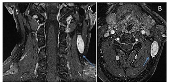 Solitary schwannoma of accessory spinal nerve. LAVA post-enhanced MRI: coronal view (A) and axial view (B) showing a non-homogenous well-defined mass (arrows) strongly enhancing along the tract of the accessory spinal nerve.