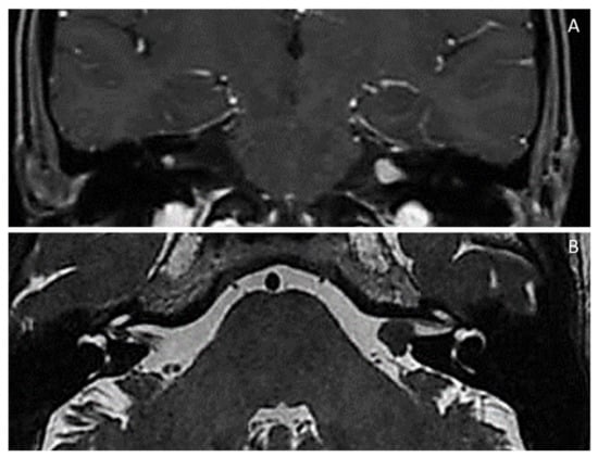 Patient with NF2-related schwannomatosis (ex-NF2): (A,B) bilateral acoustic schwannoma is pathognomonic.