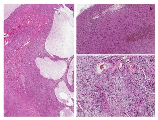 Schwannoma with “ancient” changes. (A) Low-magnification image showing cystic stromal changes and stromal hyalinization. (B) Hemorrhages can be observed intermingling with tumor cells that exhibit nuclear atypia. (C) Thick-walled vessels are seen.