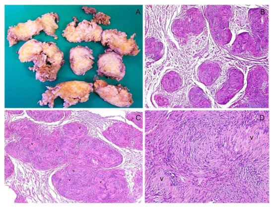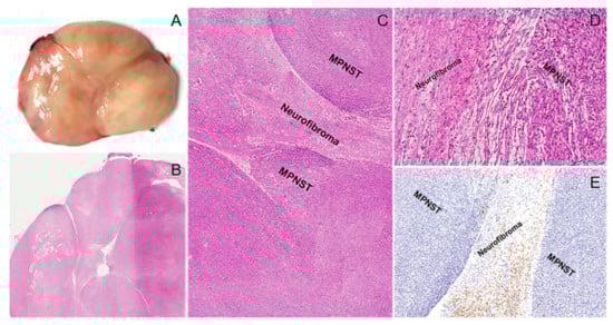 - Kacerovska, D.; Michal, M.; Kuroda, N.; Tanaka, A.; Sima, R.; Denisjuk, N.; Kreuzberg, B.; Ricarova, R.; Kazakov, D.V. Hybrid peripheral nerve sheath tumors, including a malignant variant in type 1 neurofibromatosis. Am. J. Dermatopathol. 2013, 35, 641–649. [Google Scholar] [CrossRef] [PubMed]