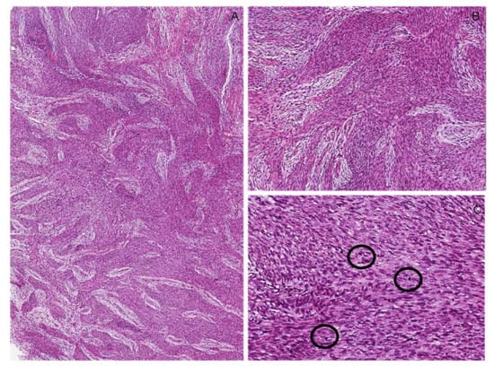 The term “atypical neurofibromatous neoplasm with uncertain biologic potential (ANNUBP)” has been recently coined [] for a subset of NF1-associated neurofibromatous tumors that exhibit at least two of the following features: (i) nuclear atypia; (ii) hypercellularity; (iii) increased mitotic activity (>1 mitosis/50 HPF but <3 mitoses/10 HPF); and (iv) a variable loss of neurofibroma architecture (i.e., the presence of herringbone and/or fascicular storiform growth patterns) (Figure 9) (Table 6). These tumors are a provisional diagnostic category created on the evidence of their virtually absent (or very low) risk of metastasis. Similar to neurofibromas with cytological atypia or hypercellularity alone, the diagnosis of ANNUBP should be rendered with caution on small biopsies, suggesting to clinicians that the examined tumor does not fit all the morphological criteria of malignancy. If the radiological suspicion of malignancy is high, a close clinical follow-up and/or additional bioptic sampling is necessary.