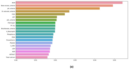 The top 20 important features in the RF and XGBoost models are shown in Figure 3. In XGBoost, BUN was the most important; the others were base excess, pH, saturation of percutaneous oxygen (SpO2), partial pressure of oxygen (PO2), and procalcitonin. In the RF model, pH was the most important feature, followed by BUN, SpO2, base excess, PO2, and total calcium.