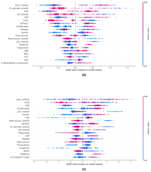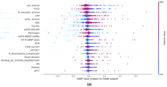 As is the case with other COVID-19 patients [56], a decrease in lymphocytes and an increase in neutrophils were observed in our study, but the levels between the two groups differed significantly; however, these variables demonstrated no feature effect in the DL model, as determined using the SHAP method. However, the neutrophil/lymphocyte ratio had a large impact. In addition, feature analysis in XGBoost, LGBM, and RF models was performed using the SHAP method. In the RF, XGBoost, and DL models, BUN had a high impact and showed a positive association with disease outcomes in the non-survivor group (Figure 4a,b,d), but high BUN levels also indicated decreased kidney function. COVID-19 causes sepsis, which causes dysfunction in various organs, including the kidneys. In patients with sepsis, fluid demand may increase [57], and BUN rises in the absence of an adequate fluid supply. Indeed, BUN was significantly higher in the non-survivor group. In the XGBoost, LGBM, RF, and DL models, the AST/ALT ratio showed a positive association with disease outcomes in the non-survivor group. Elevated AST and ALT were also observed [56], and in our study, these levels tended to be higher in the non-survivor group, but the results were not statistically significant. However, the AST/ALT ratio was significantly higher in the non-survivor group; its feature impact was high in the XGBoost, LGBM, RF, and DL models. The importance of AST and ALT in respiratory diseases may be low in clinical practice; however, we found that they were important indicators for COVID-19 mortality. In contrast to tree-based ML models (e.g., XGBoost, LGBM, and RF), only the DL model demonstrated how features affect heart disease and a patient’s general condition. Our findings confirmed that capabilities differed between DL and ML models.