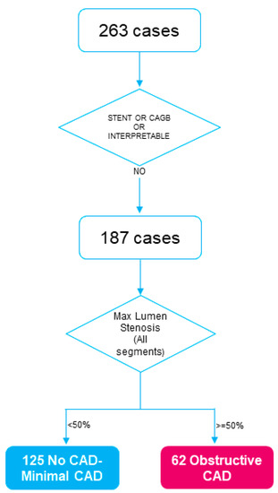 Flow chart depicting the distribution of the cohort in CAD-severity groups based on the CTCA imaging at the follow-up step. in total, 287 patient imaging data (125 in Class 1 and 62 in Class 2) were analyzed. (CAGB, coronary artery bypass graft surgery; CAD, coronary artery disease).