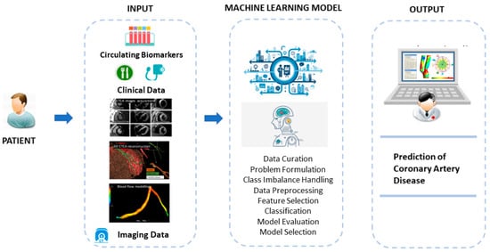 Overall pipeline of the proposed methodology. The input is based on clinical data, laboratory test, and imaging data provided by the three-dimensional reconstruction of the artery and the blood-flow modelling. Different machine learning models were implemented for the prediction of coronary artery disease presence.