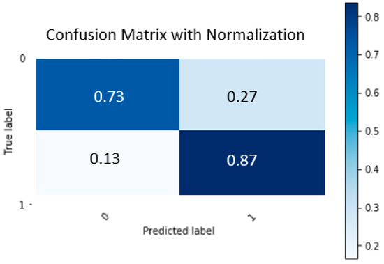 Normalized Confusion Matrix regarding the Gradient Boosting Classification algorithm for the CAD risk prediction using imaging and non-imaging data. The percentage of the true negative predicted cases is 73%, whereas the percentage of the true positives cases is 87%.