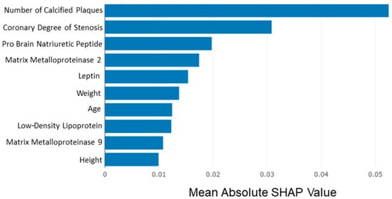 Additionally, a SHAPley Additive exPlanations (SHAP) analysis was implemented for explaining the prediction of the proposed model by computing the contribution of each feature to the prediction [28]. The most important predictors of the proposed model are presented in Figure 4 below. Mean absolute SHAP values for the 10 most significant features are estimated to illustrate the global feature importance. As it is shown in Figure 4, the most significant feature is the number of the existing calcified plaques and the highest coronary degree of stenosis at the baseline step. In addition to this, input features such as pro-brain natriuretic peptide (NT-proBNP), matrix metalloproteinase-2 and 9 (MMP-2, MMP-9), leptin, low-density lipoprotein (LDL), and patient characteristics such as weight, age, and height are highly ranked as significant features for the prognosis of coronary artery disease (CAD).