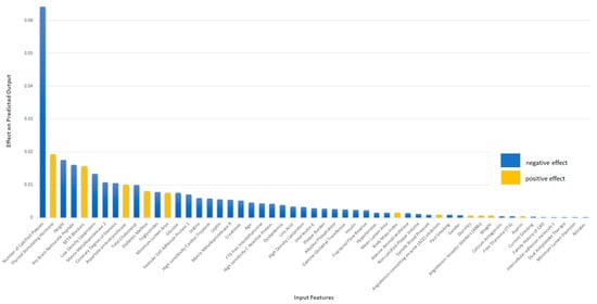 In addition to this, in Figure 5 below, we demonstrate the global interpretability of the proposed model by representing how much each input feature, either positively or negatively, contributes to the target variable. In Figure 5, we show with yellow columns the input features that contribute positively to the output target (detection of Class 2, CAD class). On the other hand, with blue columns, we indicate the input predictors that contribute negatively to the output target (detection of Class 1, no-CAD class). As it is shown in Figure 5, most of the input features contribute negatively to the output target and contribute to the prognosis of Class 1. Indicatively, the most significant features that contribute positively to the output target are thyroid stimulating hormone, medication therapy of beta blockers, aspartate aminotransferase, diabetes, and minimum lumen area. In the presented model, we observe that the most significant predictor for the prognosis of CAD is thyroid stimulating hormone, which confirms the effect of the thyroid hormones on the cardiovascular system [29,30]. Thyroid hormone is considered is a significant regulator of cardiovascular system function and hemodynamics through different mechanisms. More specifically, inadequate thyroid hormone levels impair the relaxation of vascular smooth muscle cells and decrease cardiac contractility by regulating calcium uptake and the expression of several contractile proteins in cardiomyocytes. Additionally, low thyroid hormone levels also increase systemic vascular resistance and induce endothelial dysfunction by reducing nitric oxide availability [31,32]. As for the imaging-based input predictors, minimum lumen area has the most significant positive effect on the proposed model. As it is shown in Figure 5, the most significant feature with negative effect on the output is the number of the calcified plaques at the baseline analysis of patient imaging. Different studies in the literature have confirmed the prognostic capability of the presence of calcified atherosclerotic plaques [33]. Calcification of the coronary arteries plays a key role in the pathophysiology of atherosclerosis, and these lesions are considered advanced lesions [34]. In addition to this, patient height contributes negatively to the prognosis of the output target, confirming the genetic relationship between height and coronary artery disease [35,36]. As for the biochemical predictors for the no-CAD class (Class 1), we observed that pro-brain natriuretic peptide, low density lipoprotein, and matrix metalloproteinase 2 have a high negative effect on the output target.