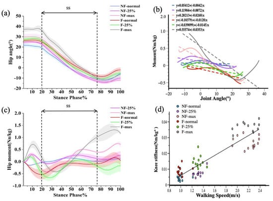 Prior studies have shown that hip joint stiffness rises with walking speed and varies dramatically over different gait cycles [40,56]. When an individual walks, the angle and moment of the hip joint fluctuate with speed, and the angle of the hip joint increases with step length in rapid walking [57]. In this study, hip stiffness increased significantly as walking speed increased, and hip stiffness was highly positively linked with speed both before and after fatigue (e.g., Figure 2d). The increase in hip stiffness during fast walking may improve power transmission [58], which matches the findings of numerous previous investigations.