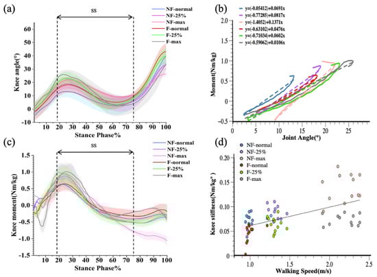 Figure 3. Graphical representations of the ensemble mean and standard deviation for knee angle (a) and knee moment (b). Joint-moment plots representing the three walking conditions before and after walking training (c), with joint stiffness calculated for the single-leg support phase (SS). Correlation plots of knee joint stiffness with walking speed before and after walking training (d).