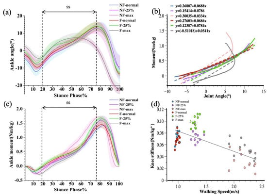 Figure 4. Graphical representations of the ensemble mean and standard deviation for ankle angle (a) and ankle moment (b). Joint-moment plots representing the three walking conditions before and after walking training (c), with joint stiffness calculated for the single-leg support phase (SS). Correlation plots of ankle joint stiffness with walking speed before and after walking training (d).