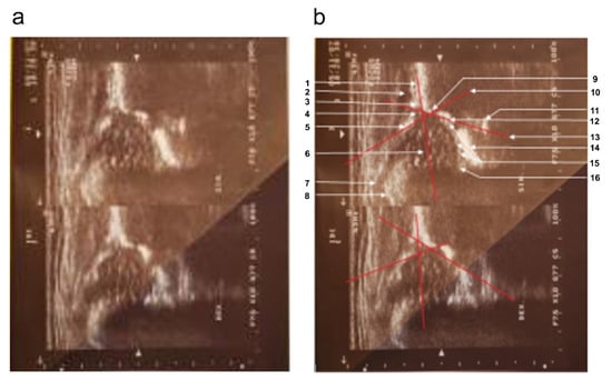 Sonograms of the girl’s hip joints at 5 weeks of age (first appointment). (a) Top (left hip joint): three basic elements are visible, i.e., the labrum, the “blunt” bone edge marking the point where the bulge of the iliac bone passes into the concavity of the acetabulum, and the lower edge of the iliac bone. The alpha angle between the bone roofline and the baseline is 65°; the beta angle between the cartilaginous roofline and the baseline is 69°. Lack of ossification nuclei (physiological norm). Type Ib according to Graf. Bottom part (right hip joint): three basic elements are visible: the labrum, the “rounded” bone edge marking the point where the protrusion of the iliac bone passes into the concavity of the acetabulum, and the lower edge of the iliac bone. The alpha angle between the bone roofline and the baseline is 56°; the beta angle between the cartilage roofline and the baseline is 74°. Lack of ossification nuclei (physiological norm). Type IIa according to Graf. (b) Sonograms with overlay and description of anatomically important points. Top: 1—baseline, 2—gluteus minimus muscle, 3—tendon of the femoral rectus muscle, 4—the cartilaginous roof of the acetabulum, 5—labrum, 6—cartilaginous femoral head (no ossification nucleus), 7—cartilaginous major trochanter with the turning synovial fold of the joint capsule, 8—cartilage–bone boundary, 9—bone edge (blunt type), i.e., turning point, 10—cartilage roofline, 11—internal perichondrium of the “Y” cartilage, 12—lower ilium bone edge, 13—bone roofline, 14—soft tissues at the bottom of the acetabulum, 15—round ligament of the femoral head, 16—transverse ligament. Bottom: marked baseline, cartilage roofline, and bone roofline.
