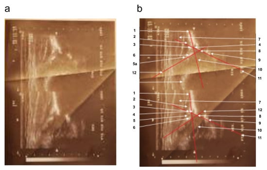 Sonograms of the girl’s hip joints at 9 weeks of age (second appointment). (a) Top part: left hip joint; alpha angle: 53°; beta angle: 74°; round bone edge. Type IIa according to Graf. Bottom: right hip joint; alpha angle: 63°; beta angle: 62°; acute bone edge type. Type Ib according to Graf. (b) Sonograms with overlay and description of anatomically important points. 1—baseline, 2—gluteus minimus muscle, 3—tendon of the femoral rectus muscle, 4—cartilage acetabular roof, 5—the disappearance of the joint capsule shadow in the region of the perichondrium defect in the adipose cushion; 5a—articular capsule, 6—acetabular labrum, 7—gluteus medium muscle, 8—bone edge (blunt type), i.e., turning point, 9—lower edge of the iliac bone, 10—cartilaginous femoral head with visualized vascular sinuses, 11—bone roofline, 12—cartilage roofline.
