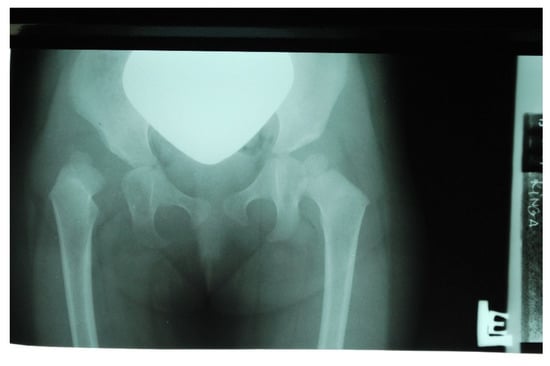 Over time, the parents noticed that the child was very slow to develop motor skills: sitting down and walking. The child did not learn to walk until 22 months of age. While climbing on a slide, the girl always used her lower left limb, without alternating her gait. While walking, she limped on her right lower limb, and reported “right leg pain”. With these observations, the parents again reported to the attending physician, an employee of a private ultrasound lab and national preluxation clinic. Due to the child’s age (24 months), an X-ray of the pelvis was performed, indicating dislocation of the right hip joint (Figure 3).