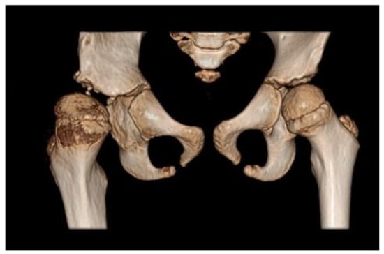 At this point, it should be noted that sometimes a situation may emerge where the diagnostic procedures (scans) produce results similar to those presented in this publication, but the associated etiology turns out to be different. This may occur when there are small differences in the sequence of genes that are important from the point of view of connective tissue function (e.g., genetic variabilities headed by single nucleotide polymorphisms (SNP)) modulating the functions of proteins but also other biomolecules, e.g., regulatory RNA [24,25]. In such cases, the doctor may not observe pathological anatomical changes in the hip in the first weeks of the child’s life. However, such genetic variations can have a long-term impact on tissue function and disrupt the anatomical development of the acetabulum, eventually leading to secondary (late) dysplasia with functional disorders of the extra-articular tissues (contracture, excessive flaccidity) [26,27]. This is especially true in the first eight years of life as the acetabulum undergoes formation [16]. These changes may further lead to joint discongruity (mismatch) and progress to hip dislocation. The same genetic factors are likely involved in the so-called recurrent dysplasia [10].