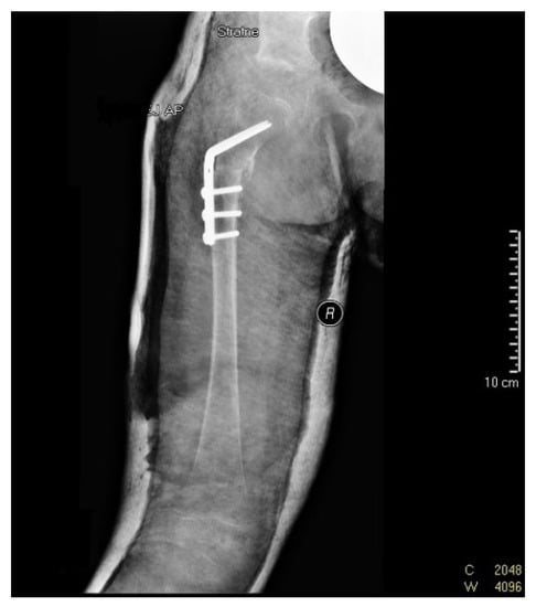 X-ray scan following varus and de-rotative osteotomy on the proximal part of the right femoral bone (at 6 years of age).