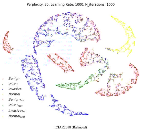The visualization result shows that our model makes a very accurate and meaningful classification even from a pathological point of view. In Figure 6, the ICIAR2018 (Balanced) dataset has benign lesions (red) of the breast with four clusters. That is why benign breast lesions are not a single disease entity. Benign breast lesions encompass adenosis, ductal hyperplasia, cystic change, columnar cell change, columnar cell hyperplasia, papilloma, fibroadenoma, even atypical ductal hyperplasia, etc. Benign lesions composed of microglandular adenosis could resemble invasive carcinoma, or benign lesions composed of atypical ductal hyperplasia could have a morphologic similarity to in situ carcinoma. Compared to the various spectrum of benign lesions, normal, in situ carcinoma and invasive carcinoma are relatively homogenous disease entities.