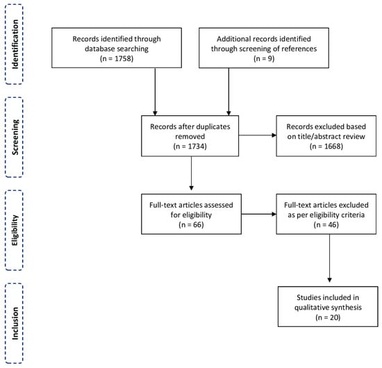 Our initial systematic search on direct OCP measurements identified 1758 articles. After the removal of duplications and title and abstract screening, a total of 66 articles remained. Next, full texts were thoroughly checked for eligibility and references were screened for additional publications of interest, resulting in a total of 20 articles from 1985 to 2021 for the final inclusion [8,9,10,11,12,13,14,15,16,17,18,19,20,21,22,23,24,25,26,27,28]. The reviewed papers and main data are shown in Table S1. Four articles reported studies using animals (New Zealand white rabbits, goats, Macaca fascicularis monkeys, and Yorkshire piglets) [13,14,15,21] and seven studies used human cadaver heads for experiments [11,17,18,20,24,26,28]. Only nine articles reported direct OCP measurements in living humans [8,9,10,12,16,19,22,23,27]. Of these, four articles reported pressure measurements during major orbital surgery [8,16,19,27]. Five articles reported minimally invasive measurements in an outpatient setting, two of them by the same group of investigators [9,10,12,22,23].