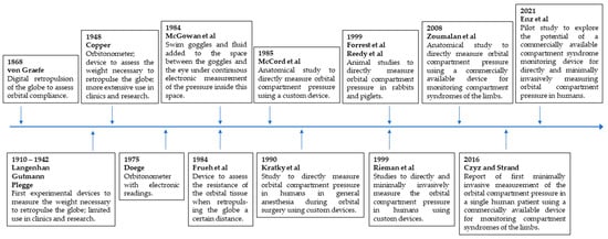 The chronological sequence of the development of the different methods to measure orbital compartment syndrome is displayed in Figure 2.