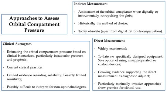 An overview of the different approaches to assess orbital compartment pressure is shown in Figure 3.