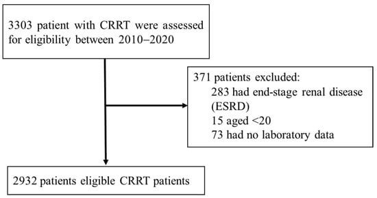 This retrospective cohort study was conducted at Changhua Christian Hospital (CCH) in central Taiwan, which is a tertiary medical center with 130 ICU beds in five wards. We identified 3303 consecutive ICU patients who received CRRT between 1 January 2010, and 30 April 2021, from the CCH Clinical Research Database (CCHRD), which contains all electronic medical records including daily CRRT records; data on inpatient care, prescriptions, and clinical visits; laboratory results; and death records. AKI was diagnosed on the basis of Kidney Disease Improving Global Outcomes (KDIGO) criteria for serum creatinine elevation, which was determined by comparing baseline serum creatinine levels at admission with those before CRRT.