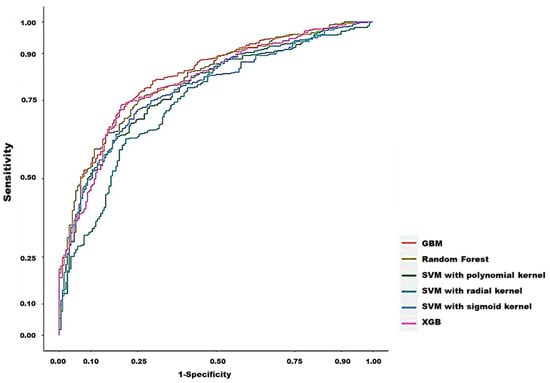 As presented in Table 2, the SVM model exhibited a moderate discrimination ability (AUC = 0.750, 95% CI = 0.708–0.792 for the radial kernel; AUC = 0.756, 95% CI = 0.745–0.821 for the sigmoid kernel; and AUC = 0.784, 95% CI = 0.745–0.822 for the polynomial kernel). The RF, XGB, and GBM models exhibited a higher discrimination ability (AUC = 0.816, 95% CI = 0.781–0.851; AUC = 0.806, 95% CI = 0.770–0.843; and AUC = 0.823, 95% CI = 0.788–0.858, respectively). Among the 3 ML models, the RF model exhibited the highest sensitivity (74.69%); however, its specificity and PPV for predicting in-hospital death (75% and 86.38%, respectively), F1 score (80.11%), and accuracy (74.79%) were lower than those of the GBM and XGB models. By contrast, the XGB and GBM models more accurately predicted in-hospital death, with sensitivity of 73.43% and 74.19%, specificity of 80.32% and 78.72%, and PPV of 88.79% and 88.10%, respectively; their F1 scores (80.38% and 80.55%, respectively) and prediction accuracy were the highest (75.64% for both, respectively). Figure 3 presents the discrimination performance of each of the six ML models, as represented by the receiver operating characteristic curve.