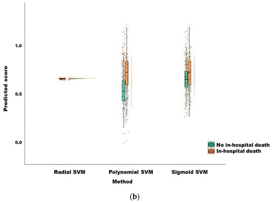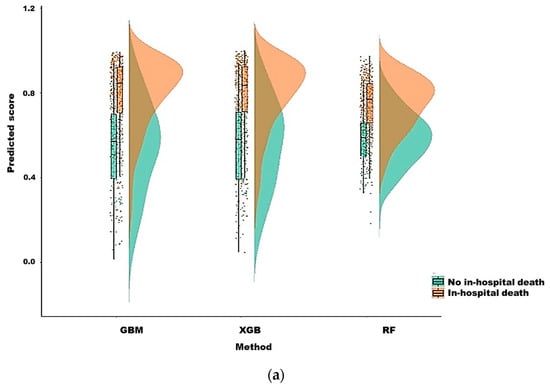 The raincloud plot of in-hospital mortality predicted score in machine learning methods. (a) GBM, XGB and random forest, (b) SVM with radial kernel, SVM with polynomial kernel, and SVM with sigmoid kernel.