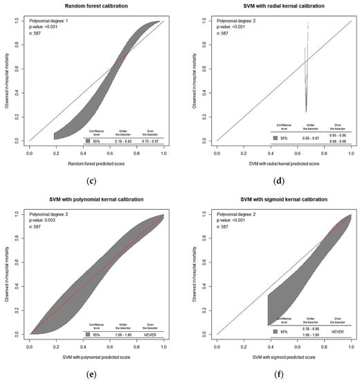 Calibration of machine learning models for predicting in-hospital mortality with calibration belts. (a) GBM, (b) XGB, (c) random forest, (d) SVM with radial kernel, (e) SVM with polynomial kernel, and (f) SVM with sigmoid kernel.
