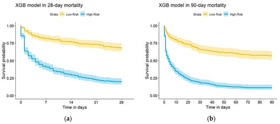 The raincloud plot depicted in Figure 4 summarizes the distribution of the predicted scores for the in-hospital death and non–in-hospital death groups. Significant differences were noted in the predicted scores between the groups in the six ML models (all p < 0.001, Kolmogorov–Smirnov test), and the median score of in-hospital death was higher than that of non-hospital death (all p < 0.001, Wilcoxon rank-sum test). Furthermore, the XGB model overlapped on the 45° dotted line, indicating favorable agreement between predicted probabilities in ML and the actual results determined using the calibration plots (p = 0.122 for the XGB model; Figure 5). The Kaplan–Meier curves showed poor survival at 28 and 90 days in the high-risk group (Figure 6).