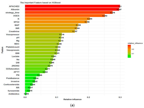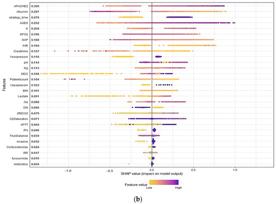 Figure 7 presents the plot of the features vital for the XGB model in order of importance according to average absolute SHAP values, which were useful for determining the contribution of each feature to individual predictions. The APACHE II score, albumin level, and timing of CRRT initiation were the top three main features, with SHAP values of 0.300, 0.297, and 0.276, respectively (Figure 7a), followed by age, potassium levels, SPO2, mean arterial pressure (MAP), INR, creatinine levels, and vasopressor use. Higher APACHE II scores; potassium, magnesium, lactate, and sodium levels; MDC scores; RDW; APTT; fluid balance; respiratory rate; and older age as well as lower SPO2, MAP, BMI, platelet count, creatinine levels, and O2 saturation were positively correlated with in-hospital death (Figure 7b). Multiple organ support use (vasopressor, vasopressin, and invasive mechanical ventilation) and medication use (corticosteroids, parenteral nutrition, antibiotics, and furosemide) were positively associated with in-hospital death. The presence of diabetes mellitus was negatively associated with in-hospital death. A nonlinear relationship was observed between pH and in-hospital mortality. Although the distribution of SHAP values was highly dispersed, the correlation of the features with in-hospital death was still consistent with the domain knowledge of most of the features.