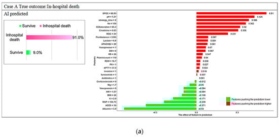 Patient A died in the hospital, and the probability of in-hospital death predicted by the ML model for patient A was 91%. Patient A had lower SPO2 (88.93), higher pH (7.21), CRRT initiated >24 h after AKI, a higher sodium level (158), lower O2 saturation (85.3), a lower creatinine level (0.83), and a higher MDC score (24); these factors were significantly positively associated with in-hospital death (Figure 8a). Patient B did not die in the hospital, and the probability of in-hospital death predicted by the ML model for patient B was 36.54%. Patient B was aged 63 years; did not require parenteral nutrition; and had a higher albumin level (3.8), higher MAP (124.36), CRRT initiated within 24 h after AKI, higher BMI (25.14), higher SPO2 (95.64), and normal laboratory values (RDW; APTT; INR; platelet count; pH; and sodium, magnesium, and potassium levels); these factors were associated with a lower risk of in-hospital death (Figure 8b).