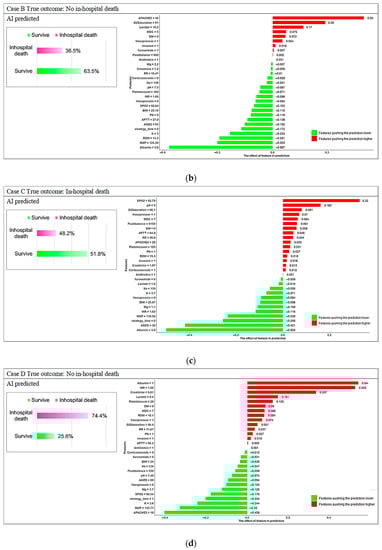 The probabilities of in-hospital death predicted using the ML model for patients C and D were inaccurate. Local explanations are presented in Figure 8c,d. The probabilities of in-hospital death for patients C and D were 48.2% and 74.4%, respectively. Despite inaccurate predictions, local interpretations can help clinicians effectively understand patients’ conditions and address key clinical features early on to modify treatment strategies and save lives. Similar results were obtained for the GBM and RF model (presented in Figure A1, Figure A2, Figure A3 and Figure A4), indicating that both the global and local interpretations of the ML model can help in making personalized care recommendations to prevent in-hospital death.