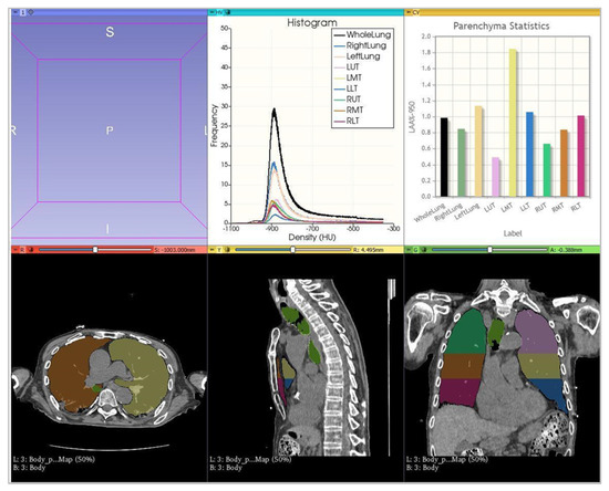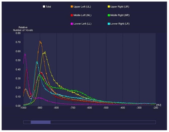 CT Pulmo 3D involved a sharp kernel (Br60) for the lung segmentation and four ranges of HU were set: first range [−1000 HU; −750 HU]; second range [−750 HU; −550 HU]; third range [−550 HU; −249 HU]; and fourth range [−249 HU; 0 HU] (Figure 6). For either software, a histogram of lung parenchyma was calculated and the area equal to or less than −750 HU was considered affected and involved based on previous studies (Figure 7 and Figure 8) [22,24].