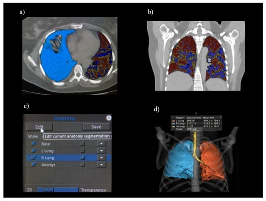 For the 3DSlicer, “Parenchyma Analysis”, a fully automatic lung segmentation and analysis of lung parenchyma histogram, was obtained using a B40f kernel (Figure 1). A radiographer (C.R.) with 5 years of experience and precisely well-trained for the software employment [22] accomplished the segmentation of each patient and, if unsatisfactory, amended the lung contours with the manual tool “Segment Editor” (Figure 2). The time employed for the manual correction was recorded.