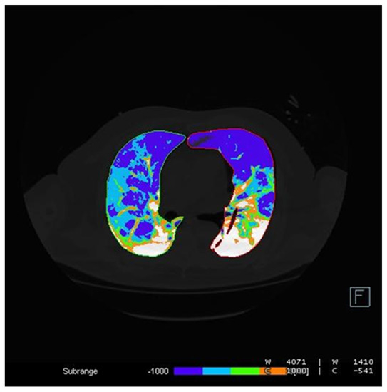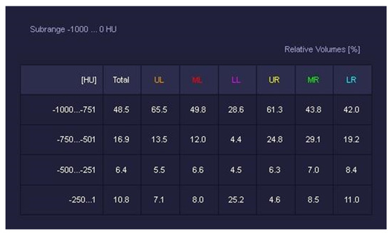 LungCTAnalyzer and the thresholds used. Here is an example of the analysis pursued. It was quantified that the “emphysematous”, “inflated”, “infiltrated”, and “collapsed” lung parenchyma were affected, and also their respective percentages were calculated.