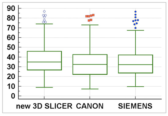 The statistical tests performed between the three software showed that the 3DSlicer delivers a higher value in the median of the measures assessed (Figure 10), whereas the ICC index returned a value of 0.92 (CI 0.90–0.94), indicating excellent reliability within the three software employed. Table 3 summarises the statistical characteristics of the values obtained with these three software.