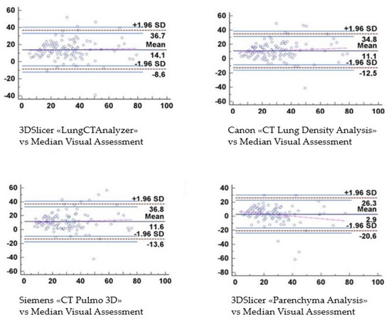 In our study, all three software have displayed overestimation during the evaluation of the concordance between visual score and their quantitative results. Particularly, the Bland–Altmann graphics underlined that the 3DSlicer “LungCTAnalyzer’’ tends to overestimate the values from 20% of the disease extension forward. Canon’s and Siemens’ software showed a comparable trend too.